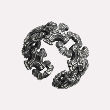 Kliver in i Bysantinska rikets prakt med denna noggrant utformade ring, smidd av högkvalitativ metallblandning. Dess intrikata, sammanlänkade design påminner om de utsmyckade mönstren i bysantinsk konst och helig arkitektur, en symbol för styrka, hängivenhet och tidlös skönhet.